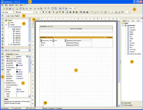 A blank report in is presented as a paper page. At any place on the page, a user can add objects, which can display different information (such as text and/or graphics), as well as define the report's appearance.